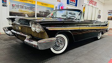 A 1958 Plymouth Fury Convertible was listed for sale this week by North Shore Classics in Mundelein, Illinois. In 1958 the Fury was an upscale Belvedere model designated by the L Code Fury package. This one is especially rare because of the stunning triple black colors and the attractive side trim. It comes with the 440 Commando engine and dual 4-barrel carburetors. And it has the iconic Chrysler push-button automatic transmission, power steering, power brakes and power convertible top. With a Sure Grip rear end and 3.54 gears, this was a pretty advanced muscle car for its era. North Shore did a walk-around video so you can get a better view of everything and hear it run. They tell us it comes with original paperwork and history. Best of all … they say it runs as good as it looks.
