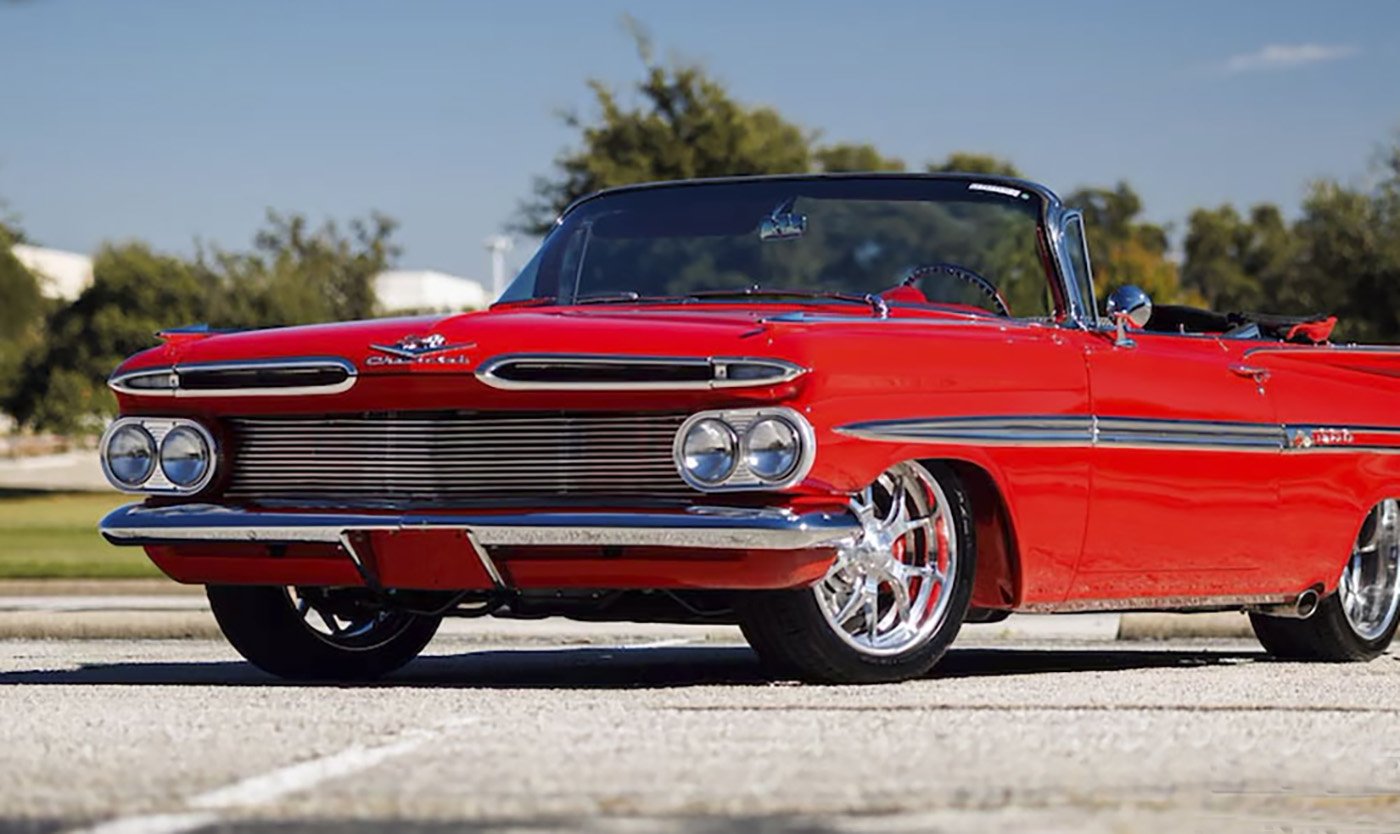 This 1959 Chevrolet Impala Convertible which was just listed for sale at Earth MotorCars in Carrollton, Texas is a great example. This one is a world class build that would be able to compete in any of the top shows in the country. A frame-off restoration, it now has an LT4 6.2L supercharged engine, 4L60E 4-speed transmission and a Currie 9-inch rear end. The custom classic has some top level quality performance add-ons that require custom fabrication, such as Morrison performance motor mounts, tubular upper and lower control arms, upgraded front sway bar, rear track bar, Stef’s Fabrication Catch Can, and a full hammered coated frame. Take a look at the photos at the link. That is a full custom interior with new seats, door panels and center console. It has a new power top, IDIDIT steering column, front and rear Wilwood drilled and slotted rotors, Classic Industries gauges, Lokar shifter, Hooker exhaust and manifolds with Magna Flow mufflers and Vintage Air. The wheels are Schott 245/45/18 and 285/35/20 with Falken tires.